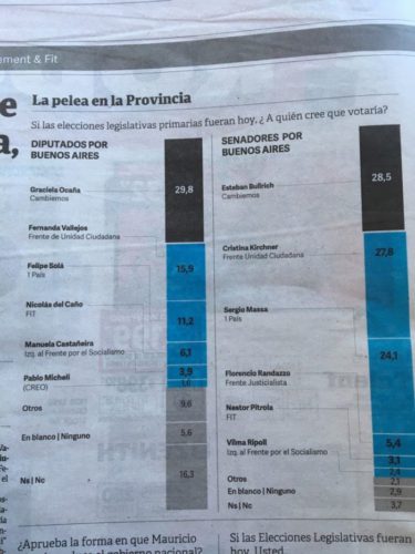 [2] No debe llamar la atención que en la encuesta de Clarín la intención de voto a senadores de Bullrich esté levemente por arriba de Cristina, cuando la mayoría de los sondeos dan cuenta de una situación inversa; si Clarín retocó la encuesta en este respecto, de todas maneras la misma parece de considerable seriedad.
