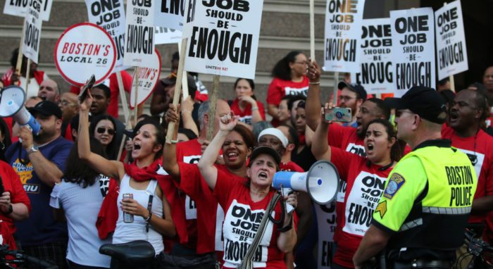 Imagen: trabajadores hoteleros de EEUU en huelga. La consigna en las pancartas: «Un solo trabajo debería ser suficiente».