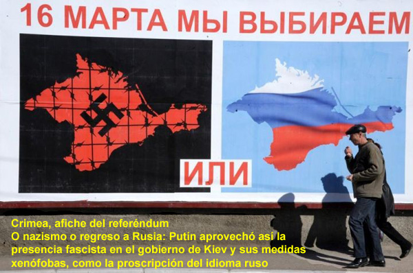 Esto no sorprendió a nadie. Ya desde el primer momento, incluso antes de plantearse formalmente el referéndum, hasta los noticieros y la prensa occidentales –especialistas en falsificaciones– alertaban que la gran mayoría de la población de Crimea no quería saber nada con el nuevo gobierno de Kiev, una coalición de oligarcas pro-Unión Europea y de fascistas confesos de Svoboda.