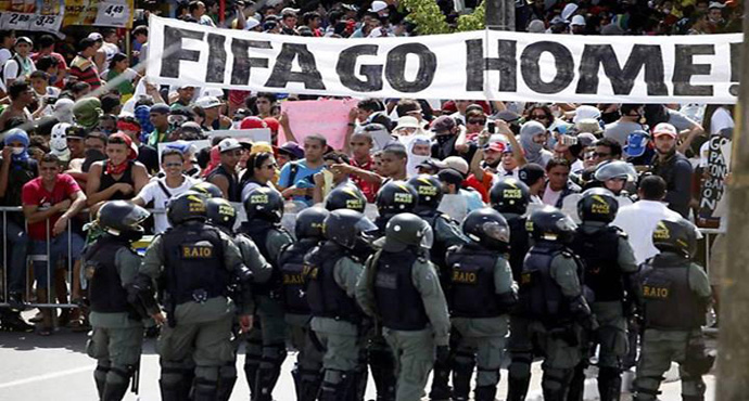 “En total, el Estado brasileño gastará 10.900 millones de dólares por este campeonato de carácter privado, mientras los negocios de la FIFA y sus patrocinadores estarán exentos de impuestos.” (Gabriel Díaz, cit.)