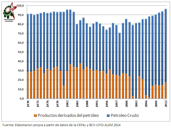No solamente los ingresos petroleros representan más del 90% de las exportaciones del país, tal como en la década de 1970, sino que a ello se añade el hecho de que dichas exportaciones en la actualidad están representadas por un mayor porcentaje de petróleo crudo. Efectivamente, hasta finales de la década de 1980, las exportaciones de productos de refinación de petróleo superaban el 30% de las exportaciones totales, durante los años noventa empieza a manifestarse un declive que encuentra su punto mínimo en 2003 como resultado del paro golpista de aquel año. En la actualidad, los productos refinados de petróleo solo alcanzan el 14% del total de las exportaciones. Este hecho reviste especial importancia en virtud de que la refinación de petróleo es una actividad manufacturera, que implica agregación de valor.
