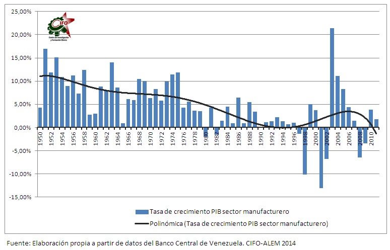 Una revisión de las tasas de crecimiento del sector manufacturero desde 1950, hasta el año pasado, revela cuando realmente empieza la “destrucción del aparato productivo nacional”, del cual se queja tanto la burguesía criolla.