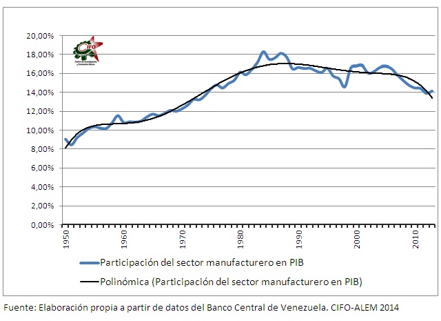 Tal como lo indica L. Vera (2009)[3], otro indicio del giro desindustrializador que toma la economía venezolana lo constituye la participación del sector manufacturero en PIB total de la economía venezolana. Tal situación se ilustra en la siguiente grafica.