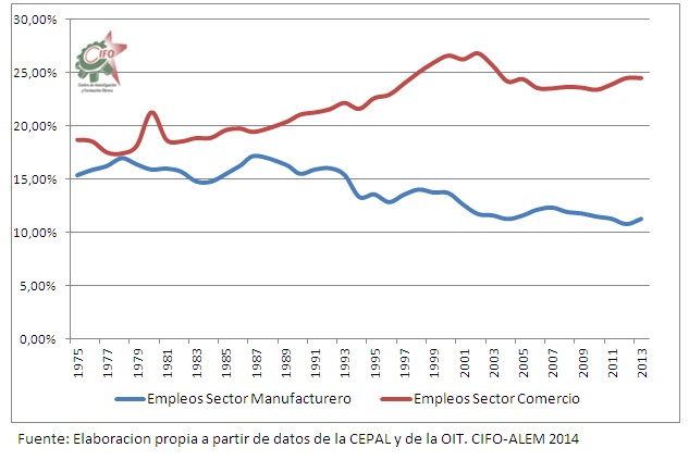 El resultado de todo lo anterior es propio de la dinámica de acumulación capitalista, en la cual el capital más ineficiente tiende a desaparecer por efecto de la competencia y con ello expulsa a un importante sector de la clase obrera, hecho que se hace evidente en las cifras de empleo sectorial. En la grafica Nº 3 está claramente visible como el empleo en el sector manufacturero no ha dejado de disminuir especialmente desde finales de los años ochenta, hasta representar hasta el año pasado poco más del 10% del total de la población ocupada, por el contrario en el sector comercio, el crecimiento es más que evidente al punto de constituirse en el sector de actividad económica con mayor participación en el empleo.