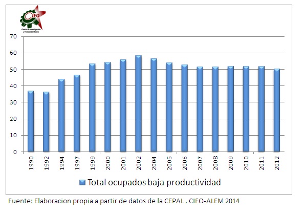 Este proceso lleva a que importantes capas de la población obrera sea desplazada hacia sectores donde su subjetividad productiva es degradada, empleándose en actividades de baja productividad. Además del sector informal de la economía, que representa alrededor del 40% de la población ocupada según el Instituto Nacional de Estadística (INE), la Comisión Económica Para América Latina (CEPAL) indica que más del 50% de la población ocupada en Venezuela lo está en empleos de baja productividad (comercio al detal, servicios, restaurantes, hoteles, etc.). Este proceso tuvo su auge durante la década de 1990 y en la actualidad permanece estable tal como lo indica la grafica Nº 4