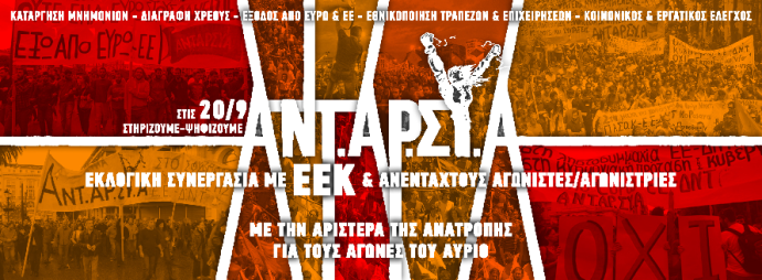 Regarding Antarsya, this revolutionary coalition has resisted the pressure that constituted the formation of Popular Unity, deciding to present an independent anti-capitalist alternative in the elections, together with the comrades of the Workers Revolutionary Party (EEK). This coalition defends anti-capitalist policies, the rupture with the memorandum, the EU and the European imperialist institutions, a strategy that is not institutional but based on the fight in the streets, fights that the comrades have built for years and specially after the «treason» of Syriza. We call to vote for Antarsya-EEK as the political expression of the struggles of the working-class against old and new memoranda, and as an anti-capitalist alternative, independent from reformist organizations.