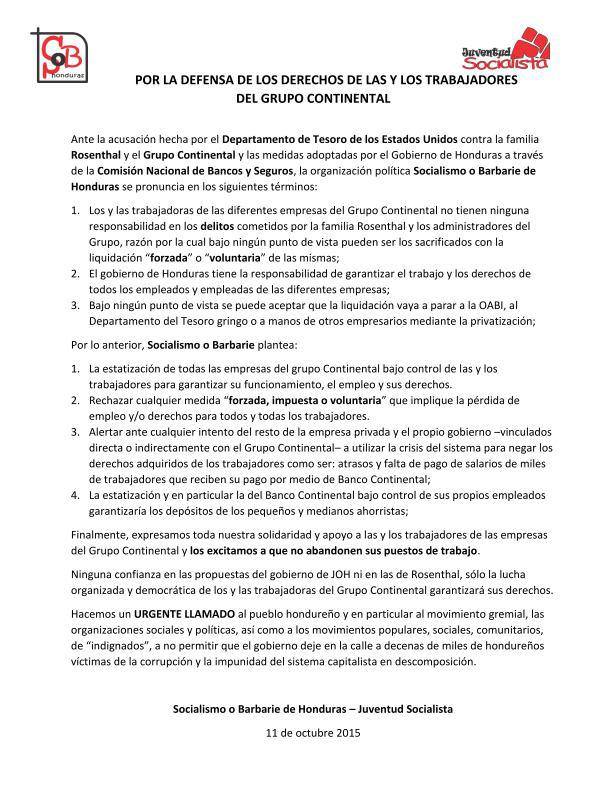 Ante la acusación hecha por el Departamento de Tesoro de los Estados Unidos contra la familia Rosenthal y el Grupo Continental y las medidas adoptadas por el Gobierno de Honduras a través de la Comisión Nacional de Bancos y Seguros, la organización política Socialismo o Barbarie de Honduras se pronuncia en los siguientes términos: