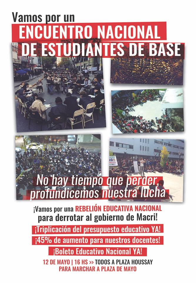 El próximo jueves, 12 de mayo, habrá una marcha convocada por todas federaciones docentes universitarias: ¡es una oportunidad inmejorable para poner en pie movilizaciones masivas en todas las universidades públicas del país, para construir una gran Marcha Nacional Educativa que ponga al gobierno ajustador contra las cuerdas! En ese sentido, el llamado de AGD a concluir la movilización en Plaza de Mayo debe ser impulsado a fondo para apuntar nuestros cañones contra Macri. Asimismo, en Capital se está convocando una movilización para el 18 de este mes, la cual también debemos impulsar y masificar. Es muy importante que esta movilización también se dirija a Plaza de Mayo: la convocatoria de los docentes en ese sentido demuestra que hay condiciones para que más sectores enfrenten globalmente al gobierno. Para derrotar al Ministro de Educación Esteban Bullrich hay que derrotar a Macri.